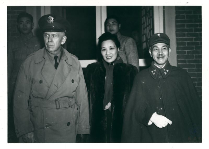 國民政府主席蔣中正伉儷至機場親迎美國駐華特使馬歇爾留影。(照片提供:國史館)